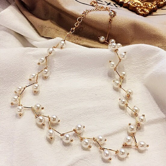 ジグザグパールチョーカータイプのネックレス(ゴールドメタル)フェイクパール使用 シンプルなデザインでパーティーからデイリーまで幅広く活躍しそうです。