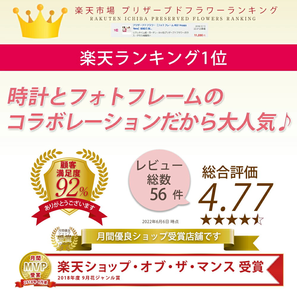 ●レビューの書き方について ●詳しいお届け日時について ●メッセージカードについて ●返品について 商品種類 プリザーブドフラワー カラーバリエーション (ホワイト) ピンク ピーチ ブルー モカ (ブラウン) ピンク ピーチ ブルー モカ サイズ 高さ約18cm×横幅約18cm×奥行き約9cm 素材 プリザーブドローズ、アジサイ、パールピック、リボン、フォトフレーム時計(花器) 注意事項 ●写真L判通常サイズ&はがきサイズの写真が縦横どちらでも飾っていただけます。