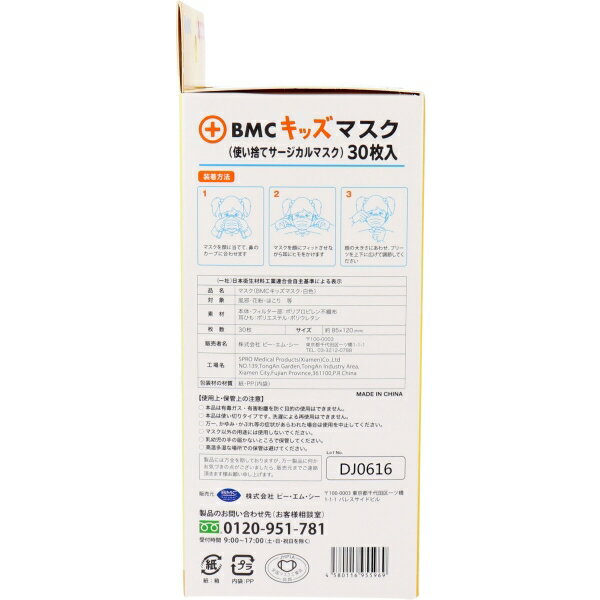 BMC フィットマスク 使い捨てサージカルマスク レディース&ジュニアサイズ 7枚入【BMC キッズマスク 使い捨てサージカルマスク 幼児・小学校低学年向け 30枚入】広告文責(有)イースクエアTEL:0120-532-772株式会社ビー・エム・シー個装サイズ:90X165X65mm個装重量:約87g内容量:30枚入ケースサイズ:58X36X38cmケース重量:約8.7kg製造国:中国【発売元:ビー・エム・シー】【品名】マスク(白色)【サイズ】約85×120mm【対象】風邪・花粉・ほこり等【素材】本体・フィルター部・・・ポリプロピレン不織布耳ひも・・・ポリエステル・ポリウレタン【使用方法】(1)マスクを顔に当てて、鼻のカーブに合わせます。