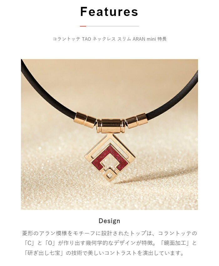 商品名:TAO ネックレス スリム ARAN mini(アラン ミニ) 品番:ABARO 医療機器認証番号:230AGBZX00077000 適応サイズ:M(43cm)、L(47cm)、LL(51cm) カラー:<ループ>ブラック<トップ・ジョイント>シャンパンゴールド×ルビーレッドラメ 材質:【本体】樹脂コーティング磁石【トップ・ジョイント】ステンレス(SUS316L/18金仕上)、エポキシ樹脂、POM 磁石:樹脂コーティング磁石 55mTを10mm間隔でN極S極交互配列 【必須記載事項】 広告文責 :ゴルフアトラス 072-924-4701 メーカー名 :株式会社コラントッテ 商品区分 :医療機器/日本製 血行 首のこり 肩こり 効果 スポーツ 男性 女性 メンズ レディース こらんとって ファッション アスリート 生活 普段使い 24時間ゴルフ 野球 スケート 卓球 テニス 陸上 マラソン 宇野 昌磨 伊藤 美誠 内川 聖一 菊池 涼介 ※ご注意:モニターの発色の具合によって実際のものと色が異なる場合がございますColantotte コラントッテ TAO ネックレス ARAN mini アラン ミニ シャンパンゴールド×ルビーレッドラメ 細いループのスリムタイプに「ARAN mini」が登場。