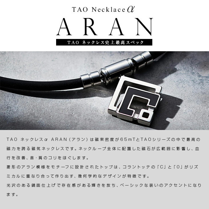 特長 ◎TAO Neclace"α" TAO ネックレスα ARAN(アラン)は磁束密度が65mTとTAOシリーズの中で最高の磁力を誇る磁気ネックレスです。