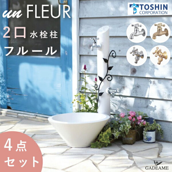[蛇口2個+パンセット]立水栓 un フルール 水栓柱 2口仕様 ガーデンパン フォーセット 横十字ハンドル フラワー/リーフ シルバー/ゴールド メッキ 真鍮 補助蛇口 ホース ホワイト 水鉢 ポット 水廻り 庭 おしゃれ オシャレ シンプル かわいい トーシン toshin 送料無料