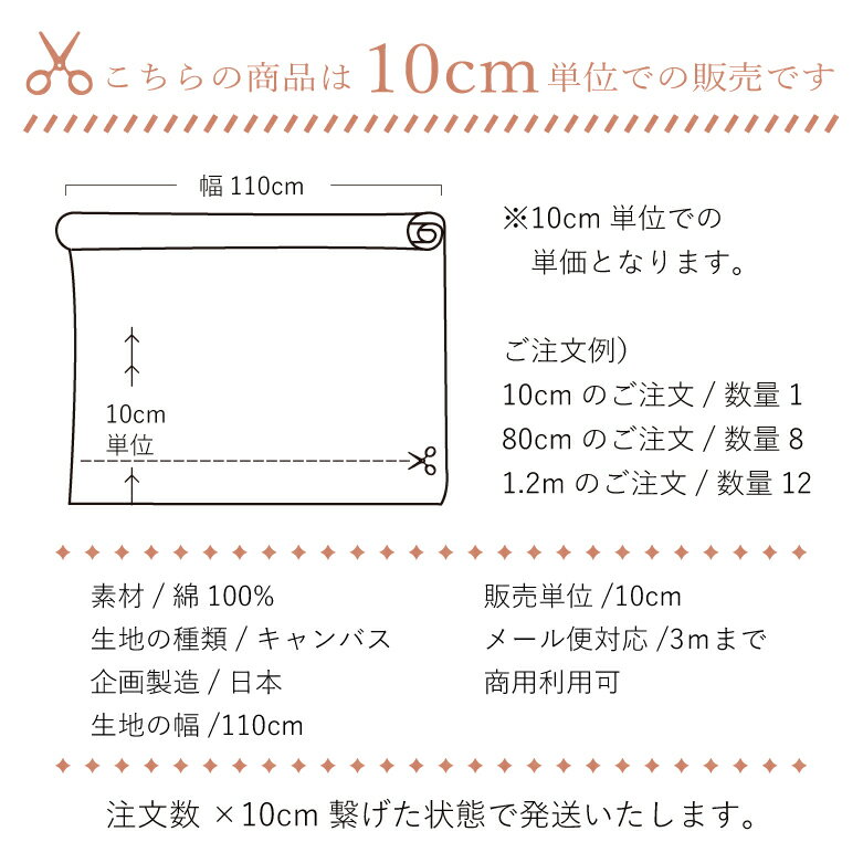 販売単位/10cm 素材/綿100% 生地の種類/コットンキャンバス 企画製造/日本 サイズ(生地の幅)/110cm メール便対応/3mまで 商用利用可 -------------------------------- ※10cm単位での単価となります 30cmの場合/数量 3 40cmの場合/数量 4 80cmの場合/数量 8 ※モニターの発色により商品画像は実際と異なる場合があります。