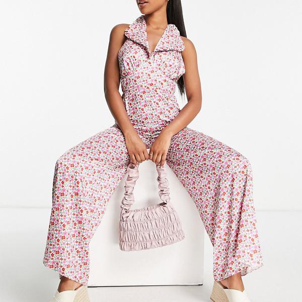 エイソス ASOS asos ASOSDESIGNビッグカラーホルターサテンディッシージャンプスーツ明るい花柄プリント オールインワン レディース 女性 インポートブランド 小さいサイズから大きいサイズまで