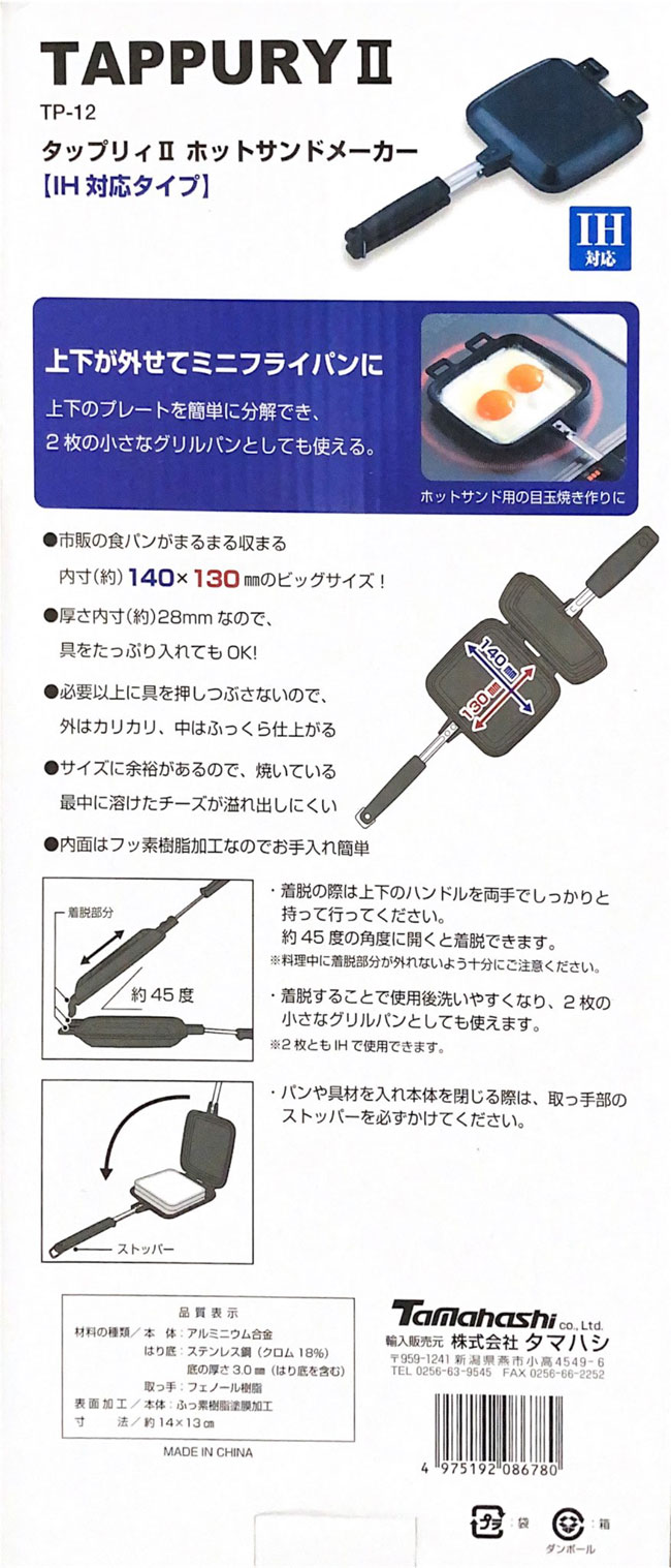 具がたっぷり入る、IH対応ホットサンドメーカー市販の食パンがまるまる収まる内寸140×130mmの大きめサイズはさんで焼くだけのカンタン調理内寸高さは28mmのため具材をたっぷり挟むことができ、季節の野菜や厚いベーコンなどを使って贅沢な彩りのホットサンドが出来上がります必要以上に具を押しつぶさないので、外はカリカリ、中はふっくら仕上がります溶けたチーズも溢れ出しにくい表面はふっ素樹脂加工でこげつきにくく、お手入れが簡単ですセパレートタイプで上下を取り外せるので、焼き面がフラットなミニフライパンとしても使えて機能的上下ともIH調理器で調理できますサイズ本体:(約)375×160×38mm、深さ15mm底の厚さ:(約)3mm焼き面:(約)140×130mm高さ(内寸)(約)28mm重量(約)750g材質本体:アルミニウム合金(表面フッ素樹脂加工)ハンドル:フェノール樹脂、ステンレス対応熱源ガスコンロ(直火)、IH調理器、ハロゲン、ラジエント、シーズ、エンクロ製造元タマハシ備考・中国生産・電子レンジ、オーブンレンジ使用不可